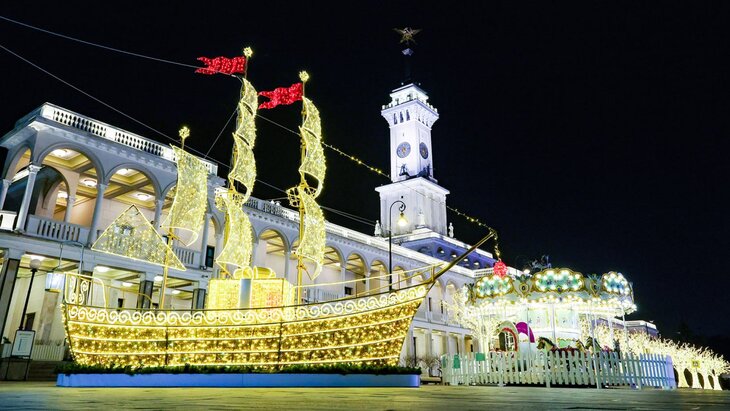 Эти тематические инсталляции выполнены в виде величественных кораблей с наполненными ветром парусами, символизирующими движение и надежду на новые свершения в наступающем году. На палубах каждого фрегата расположились новогодние подарки, создавая атмосферу волшебства и ожидания праздника. Длина каждого судна достигает 10 метров, а яркая светодиодная подсветка придает им особое сияние в вечернее время, привлекая внимание прохожих и создавая праздничное настроение.Фрегаты установлены непосредственно возле зданий речных вокзалов, что позволяет гостям и жителям города наслаждаться их красотой в непосредственной близости. Рядом с ними размещены новогодние ели, украшенные разноцветными шарами, звездами, светящимися гирляндами и другими праздничными элементами декора. Особое внимание уделено Северному речному вокзалу, где дополнительно смонтировали световые деревья, усиливающие эффект сказочной атмосферы и создающие уникальный визуальный ансамбль.Таким образом, оформление речных вокзалов не только подчеркивает важность этих транспортных узлов, но и способствует созданию в городе праздничного настроения, объединяя жителей и гостей Москвы в предвкушении Нового года. Эти масштабные и яркие инсталляции стали символом надежды, радости и новых возможностей, которые приносит с собой наступающий год.В преддверии новогодних и рождественских праздников столица превращается в настоящую сказку благодаря масштабной праздничной иллюминации и украшениям, которые создают волшебное настроение для жителей и гостей города. Бирюков подчеркнул, что в этом году в Москве установили более 4 тысяч декоративных элементов и новогодних елей, которые не только украшают улицы, но и служат дополнительным источником света в темное время суток, делая город более уютным и безопасным. Особое внимание уделено световым инсталляциям: на Пушкинской площади и в Новопушкинском сквере, а также на Тверской и Манежной площадях, Газетном и Камергерском переулках уже появились световые арки. Эти конструкции прошли модернизацию и теперь функционируют в полноцветном режиме с возможностью программного управления различными световыми сценариями, что позволяет создавать динамичные и эффектные световые шоу. Кроме того, традиционно пешеходные зоны Бульварного кольца украшены световыми тоннелями и цифрами "2026", символизирующими наступающий год. В парке Победы на Поклонной горе установили огромный елочный шар, который стал центральным элементом праздничного оформления и привлекает внимание многочисленных посетителей. Такие масштабные мероприятия не только поднимают праздничное настроение, но и способствуют развитию городской культуры и туризма, делая Москву привлекательной в зимний сезон. Глава комплекса городского хозяйства отметил важность этих проектов для поддержания праздничной атмосферы и повышения качества городской среды.В последние годы Москва активно совершенствует свою праздничную иллюминацию, делая город не только красивее, но и экологичнее. Для украшения столицы используется современное энергосберегающее оборудование на светодиодах, которое отличается высокой энергоэффективностью и долговечностью. Такие светильники потребляют значительно меньше электроэнергии по сравнению с традиционными лампами и рассчитаны на ста